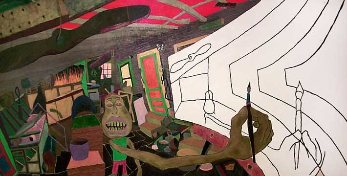 So i had to teach myself to move so slowly that they wouldn’t know i was there. It was a bit nerve-wracking, but also Zen. (And quite hot: July & i couldn’t use fans because there was no electricity.) I ended up drawing a fish-eye-lens kind of image of the canvas, the easel, all of the studio behind it (including a wooden airplane propeller unaccountably suspended from the ceiling, a window (with added flames outside), & myself in the process of painting it (in the form of the classic Sensory Homunculus). On the image of the blank canvas was the beginning of the drawing of the picture itself. I called it “Blasphemies of the Dwarf Jester” & JR Compton bought it from me after the show.